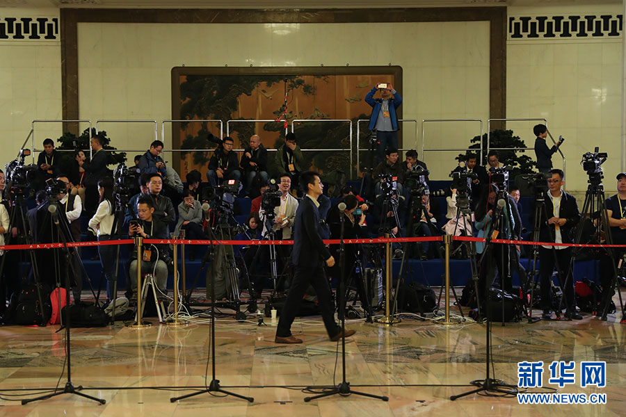 10月19日,“黨代表通道”第二場采訪活動在人民大會堂舉行。圖為現場媒體記者正在做采訪準備。新華網 翟子赫 攝