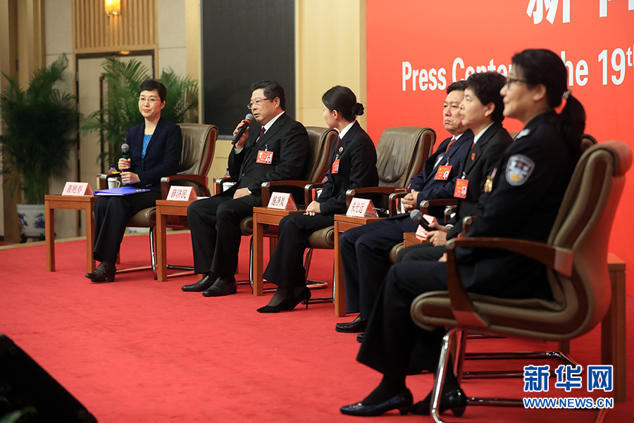 ??? 10月19日,十九大新聞中心舉辦集體采訪,邀請政法戰線代表談全面推進依法治國。圖為采訪現場。新華網 郝廣鵬攝