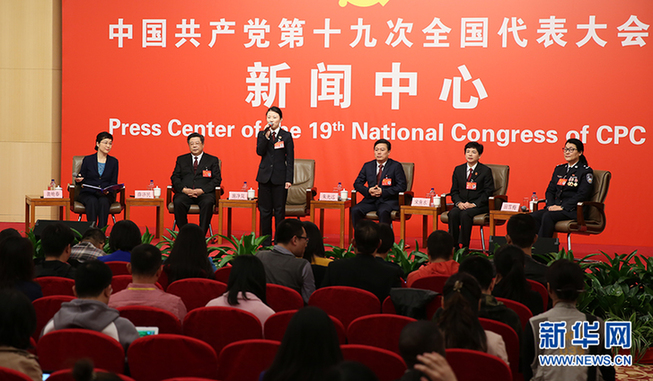 ??? 10月19日,十九大新聞中心舉辦集體采訪,邀請政法戰線代表談推進全面依法治國。圖為采訪現場。新華網 郝廣鵬攝
