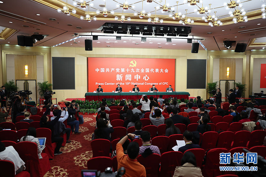 ??? 10月19日,十九大新聞中心舉辦集體采訪,邀請工信和通訊領域代表談走新型工業化道路。圖為采訪現場。新華網 郝廣鵬攝
