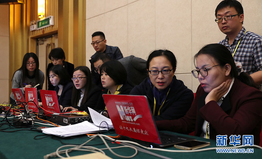 ??? 10月20日,十九大新聞中心舉行記者會,邀請中宣部、中央文明辦、文化部、新聞出版廣電總局相關負責人介紹加強思想道德和文化建設情況,并回答記者提問。圖為新華網在現場直播。新華網 郝廣鵬 攝