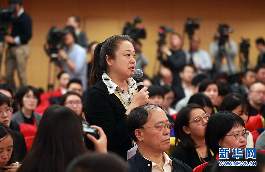 ??? 10月20日,十九大新聞中心舉行記者會,邀請中宣部、中央文明辦、文化部、新聞出版廣電總局相關負責人介紹加強思想道德和文化建設情況,并回答記者提問。圖為中央人民廣播電臺記者提問。新華網 郝廣鵬 攝