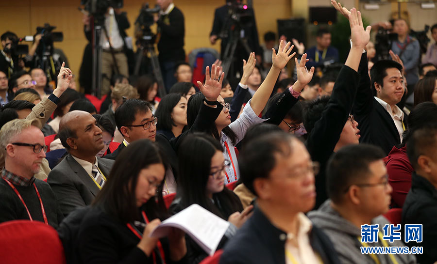 10月21日,十九大新聞中心舉辦記者招待會(huì),邀請(qǐng)中共中央統(tǒng)戰(zhàn)部常務(wù)副部長(zhǎng)張裔炯、副部長(zhǎng)冉萬(wàn)祥,中共中央對(duì)外聯(lián)絡(luò)部副部長(zhǎng)郭業(yè)洲介紹黨的統(tǒng)一戰(zhàn)線工作和黨的對(duì)外交往情況,并回答記者提問(wèn)。圖為現(xiàn)場(chǎng)記者。新華網(wǎng) 郝廣鵬攝