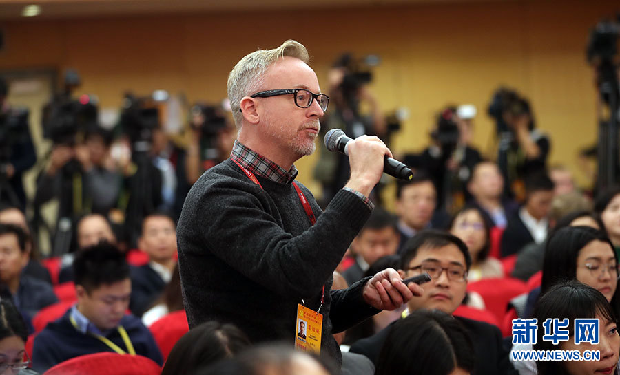 10月21日,十九大新聞中心舉辦記者招待會(huì),邀請(qǐng)中共中央統(tǒng)戰(zhàn)部常務(wù)副部長(zhǎng)張裔炯、副部長(zhǎng)冉萬祥,中共中央對(duì)外聯(lián)絡(luò)部副部長(zhǎng)郭業(yè)洲介紹黨的統(tǒng)一戰(zhàn)線工作和黨的對(duì)外交往情況,并回答記者提問。圖為美聯(lián)社記者提問。新華網(wǎng) 郝廣鵬攝