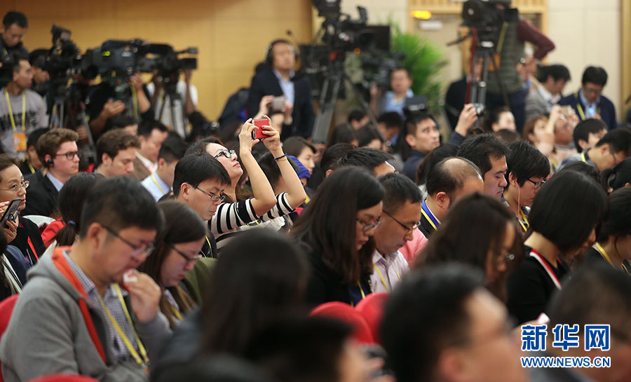 10月23日,十九大新聞中心舉辦記者招待會(huì),邀請中央財(cái)經(jīng)領(lǐng)導(dǎo)小組辦公室副主任楊偉民,環(huán)境保護(hù)部黨組書記、部長李干杰介紹踐行綠色發(fā)展理念,建設(shè)美麗中國有關(guān)情況,并回答記者提問。圖為現(xiàn)場記者。新華網(wǎng) 郝廣鵬攝