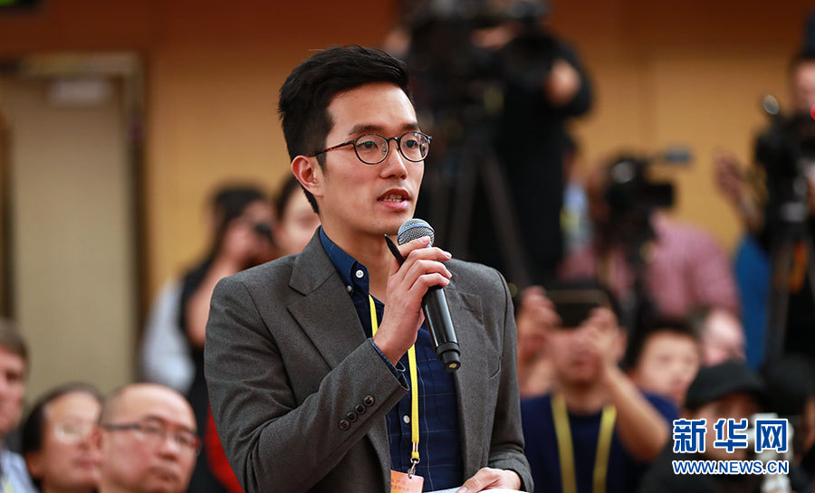 10月23日,十九大新聞中心舉辦記者招待會,邀請中央財經(jīng)領導小組辦公室副主任楊偉民,環(huán)境保護部黨組書記、部長李干杰介紹踐行綠色發(fā)展理念,建設美麗中國有關情況,并回答記者提問。圖為香港商業(yè)電臺記者提問。新華網(wǎng) 郝廣鵬攝