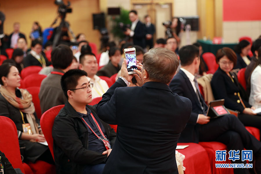 10月23日,十九大新聞中心舉辦集體采訪活動,主題為“打好生態環保攻堅戰”。圖為現場記者。新華網 郝廣鵬攝
