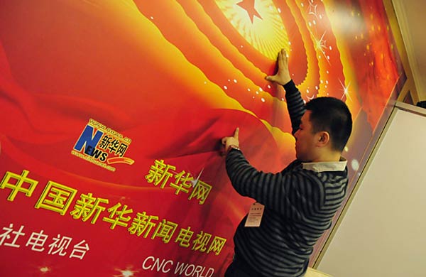 3月1日,新華網兩會報道人員正在布置工作間。第十一屆全國人民代表大會第四次會議、全國政協十一屆四次會議即將開幕。