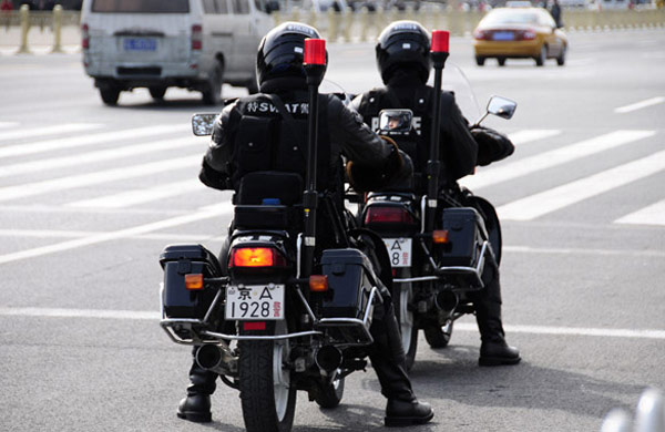 3月1日,特警隊員在人民大會堂東門外巡邏。十一屆全國人大第四次會議、全國政協十一屆四次會議即將開幕。