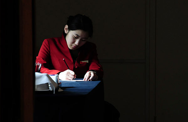 3月1日,人民大會堂工作人員正在進行緊張的會前準備工作。第十一屆全國人民代表大會第四次會議、全國政協十一屆四次會議即將開幕。