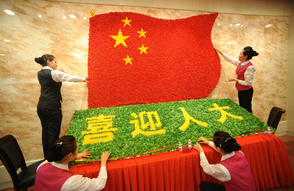 3月2日,京西賓館的服務員用絹花拼出國旗和“喜迎人大”的圖案。當日,為了迎接全國人大代表入住,京西賓館的服務員自發設計,并從市場上采購來絹花,在餐廳拼出組合圖案,表達“喜迎人大”的心情。