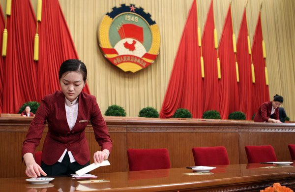 3月1日,人民大會堂工作人員正在進行緊張的會前準備。第十一屆全國人民代表大會第四次會議、全國政協十一屆四次會議即將開幕。