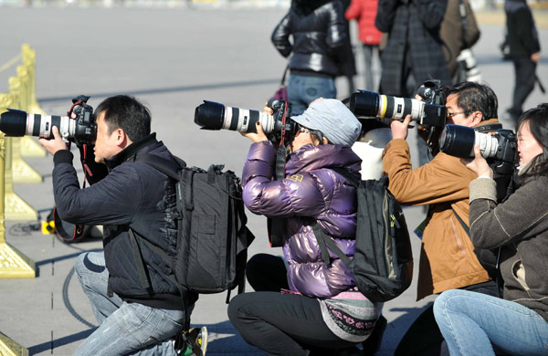 3月3日,4名攝影記者蹲在地上拍照。當日,中國人民政治協商會議第十一屆全國委員會第四次會議在北京人民大會堂開幕。