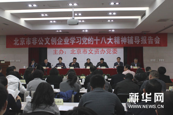 ??? 新華網北京11月28日電 (記者 陳元)27日,北京市國有文化資產監(jiān)督管理辦公室(簡稱文資辦)召開非公有制文化創(chuàng)意企業(yè)學習宣傳黨的十八大精神輔導報告會。來自北京市的百余家非公文創(chuàng)企業(yè)代表參加了報告會。