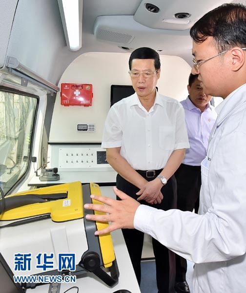 ??? 6月5日,中共中央政治局常委、國務院副總理張高麗到中國環境科學研究院和中國環境監測總站調研。這是張高麗在水質應急監測車上了解水質監測預警工作情況。新華社記者 李濤 攝