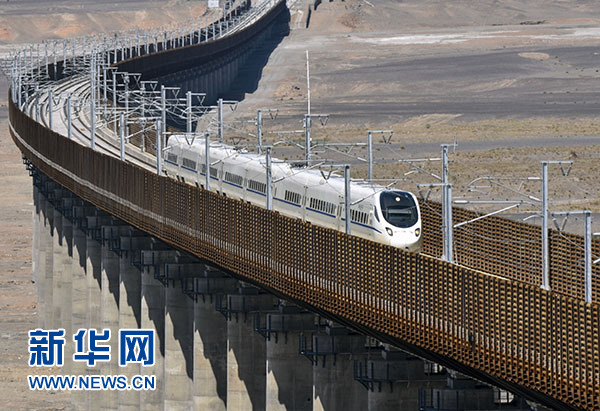 動(dòng)車行駛在哈密地區(qū)的一座大橋上(2015年5月22日攝)。 新華社記者 吳丹妮 攝