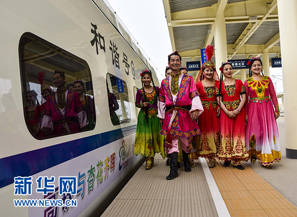 身穿民族服飾的當(dāng)?shù)鼐用裨谕卖敺闭居邮着俗案哞F杏花專列”抵達(dá)前來(lái)旅游的游客(2015年3月21日攝)。 新華社記者 趙戈 攝