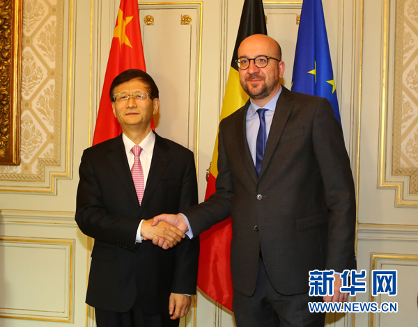5月19日,在比利時首都布魯塞爾,比利時首相米歇爾(右)會見到訪的習近平主席特使、中共中央政治局委員、中央政法委書記孟建柱。新華社記者龔兵攝