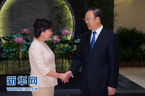 6月7日,中共中央書記處書記、全國政協副主席杜青林在澳門會見來華出席太湖世界文化論壇第四屆年會的吉爾吉斯斯坦副總理庫代別爾季耶娃。新華社記者 張金加 攝