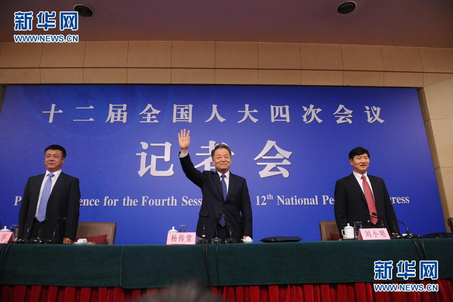 十二屆全國人大四次會議新聞中心于3月14日(星期一)10時在梅地亞中心多功能廳舉行記者會,邀請交通運輸部部長楊傳堂、交通運輸部運輸服務司司長劉小明、北京交通發展研究中心主任郭繼孚就“深化出租汽車改革與發展”的相關問題回答中外記者的提問。圖為楊傳堂、劉小明、郭繼孚到達會場,楊傳堂向記者揮手致意。新華網/中國政府網 陳杰 攝?