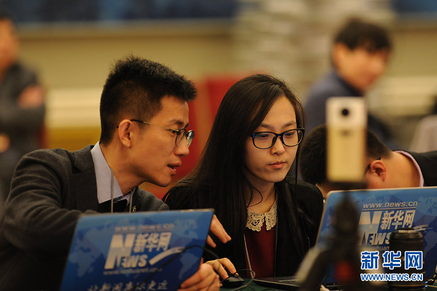 3月16日上午,國務院總理李克強在人民大會堂三樓金色大廳會見采訪十二屆全國人大四次會議的中外記者并回答記者提出的問題。圖為新華網記者準備總理記者會直播。新華網/中國政府網 陳杰攝