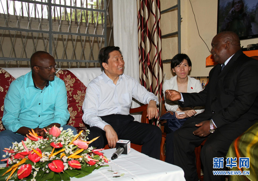 ??? 5月12日,在布隆迪首都布瓊布拉,正在布隆迪訪問的中國國家副主席李源潮(左二)在布第一副總統辛迪姆沃(左一)陪同下,專門來到布隆迪大學教授勞塞夫(右一)家中走訪,受到了勞塞夫一家的熱情歡迎和接待。新華社記者呂天然攝
