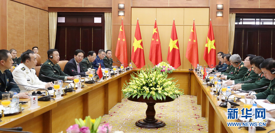 ??? 6月18日,在越南首都河內,正在越南訪問的中央軍委副主席范長龍(左三)與越南國防部長吳春歷(右三)舉行會談。 新華社發(李曉偉攝)