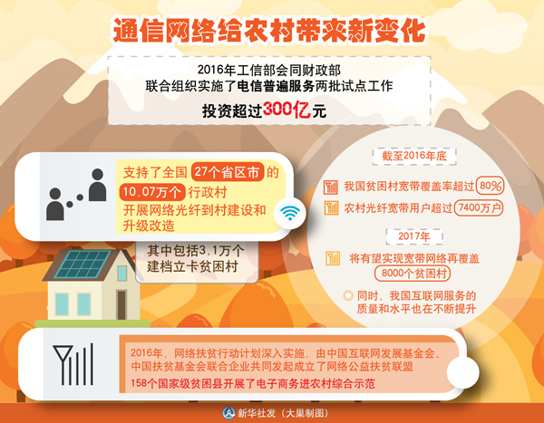 近年來,我國加大對中西部地區和農村貧困地區移動互聯網基礎設施建設的投資力度,加快推進貧困地區網絡全覆蓋,著力降低貧困群眾享受信息生活門檻。截至2016年底,我國貧困村寬帶覆蓋率超過80%,農村光纖寬帶用戶超過7400萬戶。今年將有望實現寬帶網絡再覆蓋8000個貧困村。同時,我國互聯網服務的質量和水平也在不斷提升。