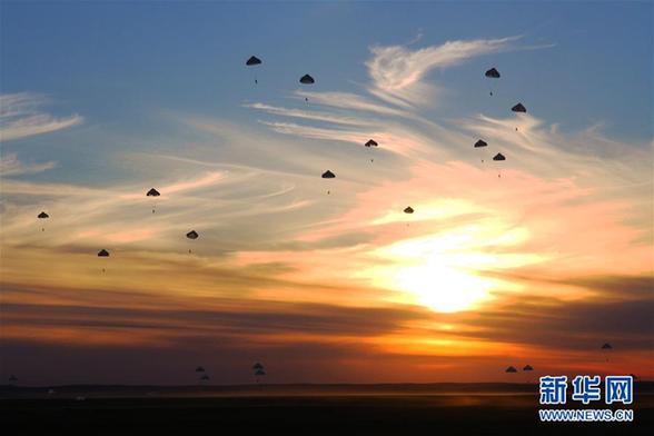 黃繼光生前所在連官兵在朱日和訓練基地參加“礪劍-2013”集群傘降訓練(2013年8月26日攝)。新華社發(袁文濤 攝)