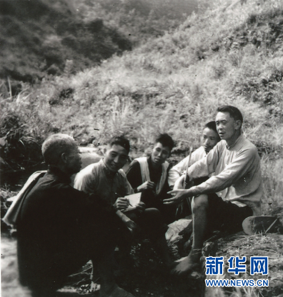 甘祖昌將軍(右一)在地頭和農民們聊天(資料圖片)。新華社發