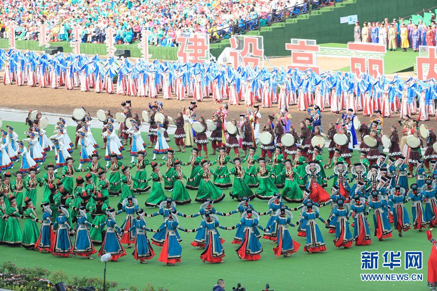 8月8日,內蒙古自治區成立70周年慶祝大會在呼和塔拉內蒙古少數民族群眾文化體育運動中心舉行。圖為群眾行進表演。新華網記者 陳杰 攝