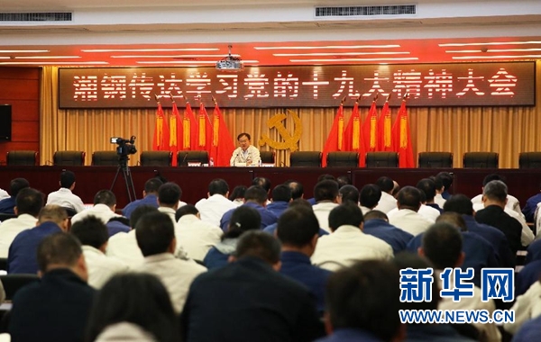 10月30日,王樹春向湖南華菱湘潭鋼鐵有限公司員工宣講黨的十九大精神。十九大代表、湖南華菱湘潭鋼鐵有限公司黨委書記王樹春從北京回到鋼廠,下車后直奔會議室,激動地向等待在此的班子成員傳達十九大精神。對這個流著紅色血液、有著9693名黨員、剛剛擺脫生存困境的老鋼廠來說,十九大精神無疑帶來了新希望、吹響了新號角。新華社發