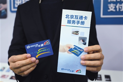 昨日,工作人員在展示京津冀互通卡。互通卡卡面右上角印有“交通聯合”標識。 北京市政交通一卡通有限公司供圖
