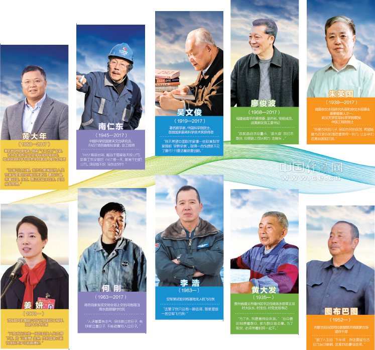 回首2017年,我國(guó)各行各業(yè)涌現(xiàn)出一批有理想情懷、有人格魅力、有卓越言行的時(shí)代先鋒。這當(dāng)中,有先后3次將自家挖出的國(guó)家級(jí)文物上交故宮博物院的普通農(nóng)民,也有帶領(lǐng)當(dāng)?shù)厝罕娪?0年的時(shí)間在懸崖峭壁上鑿出近10公里長(zhǎng)“生命渠”的老支書(shū),還有為了中國(guó)天文事業(yè)拄著竹竿、翻山越嶺踏遍貴州大山所有洼地為射電望遠(yuǎn)鏡選址的“天眼之父”。