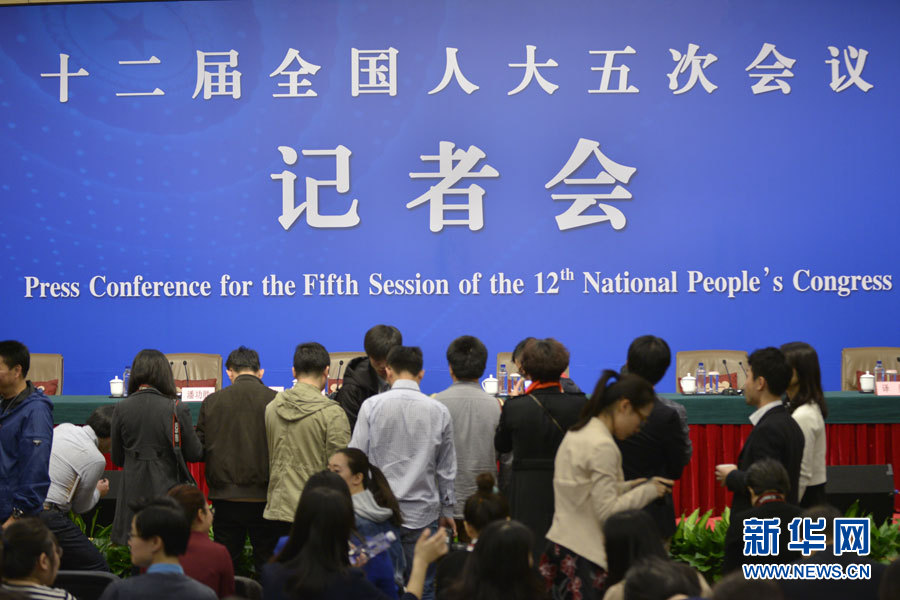 3月10日,十二屆全國人大五次會議新聞中心舉行記者會,邀請中國人民銀行行長周小川、副行長易綱、副行長兼國家外匯管理局局長潘功勝、副行長范一飛就“金融改革與發展”的相關問題回答中外記者的提問。圖為記者會現場。新華網/中國政府網 王健 攝