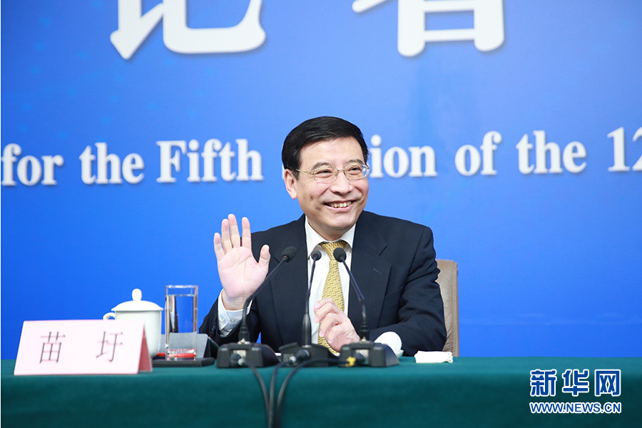 3月11日,十二屆全國人大五次會議新聞中心舉行記者會,邀請工業和信息化部部長苗圩、副部長辛國斌和總工程師、新聞發言人張峰就“推進實施‘中國制造2025’”的相關問題回答中外記者的提問。圖為工業和信息化部部長苗圩。新華網/中國政府網?翟子赫 攝