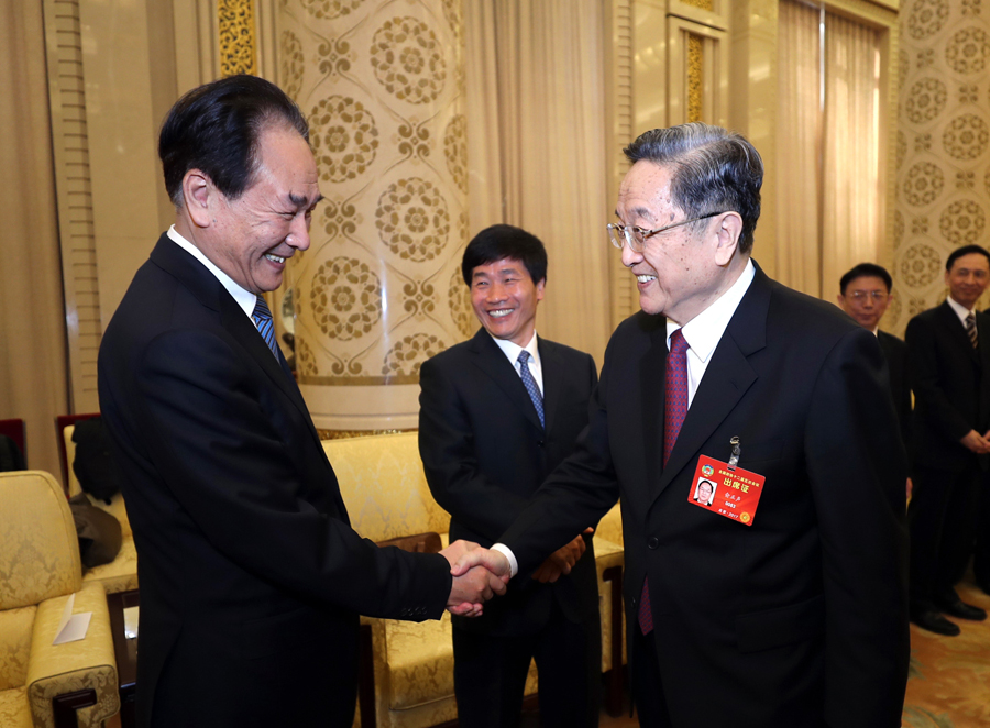 ??? 3月13日,中共中央政治局常委、全國政協主席俞正聲在北京人民大會堂看望參加全國政協十二屆五次會議新聞報道工作的中央主要新聞媒體負責同志和記者代表,向參加大會報道的新聞工作者表示誠摯慰問和衷心感謝。這是俞正聲與新華社社長蔡名照握手。新華社記者 鞠鵬 攝