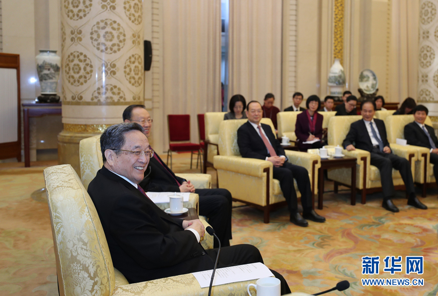 ??? 3月13日,中共中央政治局常委、全國政協主席俞正聲在北京人民大會堂看望參加全國政協十二屆五次會議新聞報道工作的中央主要新聞媒體負責同志和記者代表,向參加大會報道的新聞工作者表示誠摯慰問和衷心感謝。新華社記者 鞠鵬 攝