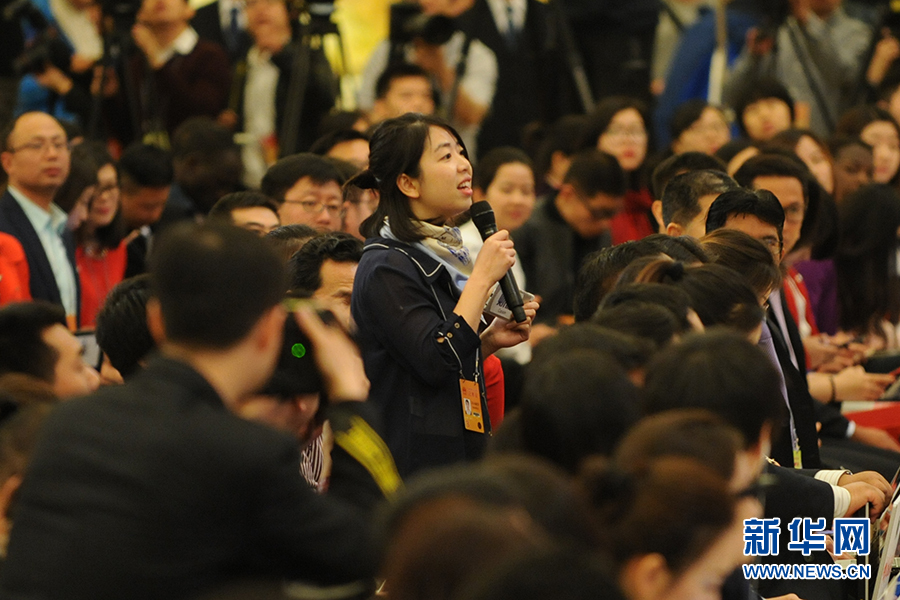 3月15日上午,國務院總理李克強在人民大會堂三樓金色大廳會見采訪十二屆全國人大五次會議的中外記者并回答記者提出的問題。圖為財新網(wǎng)、財新周刊記者提問。新華網(wǎng)/中國政府網(wǎng) 翟子赫 攝?