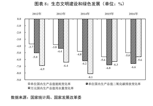 (七)加強(qiáng)生態(tài)環(huán)境保護(hù)和能源資源節(jié)約,綠色發(fā)展初見(jiàn)成效。單位國(guó)內(nèi)生產(chǎn)總值能耗和二氧化碳排放量分別下降5%和6.6%,超額完成全年目標(biāo),化學(xué)需氧量、氨氮、二氧化硫、氮氧化物排放量預(yù)計(jì)分別下降2.6%、2.9%、5.6%、4.0%,地級(jí)及以上城市空氣質(zhì)量?jī)?yōu)良天數(shù)比例同比提高2.1個(gè)百分點(diǎn),74個(gè)重點(diǎn)城市細(xì)顆粒物(PM2.5)年均濃度下降9.1%,地表水達(dá)到或好于Ⅲ類(lèi)水體比例同比提高1.8個(gè)百分點(diǎn)、劣Ⅴ類(lèi)水體比例同比下降1.1個(gè)百分點(diǎn),萬(wàn)元國(guó)內(nèi)生產(chǎn)總值用水量下降5.6%。