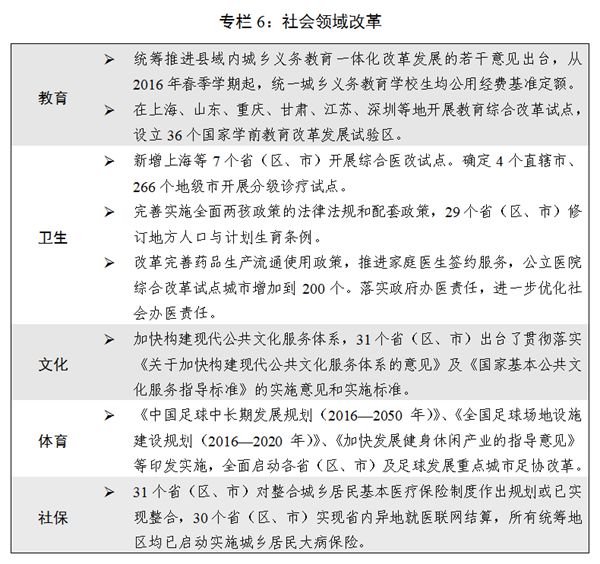 七是社會(huì)領(lǐng)域改革加快推進(jìn)。中央和國(guó)家機(jī)關(guān)公務(wù)用車(chē)制度改革全面完成,地方黨政機(jī)關(guān)公車(chē)改革深入推進(jìn)。行業(yè)協(xié)會(huì)商會(huì)與行政機(jī)關(guān)脫鉤改革第二批試點(diǎn)啟動(dòng)實(shí)施。加快不動(dòng)產(chǎn)統(tǒng)一登記制度落地,全國(guó)100%的地(市、州)、98%的縣(市、區(qū))實(shí)現(xiàn)“發(fā)新停舊”。國(guó)家科技計(jì)劃管理改革繼續(xù)深化,以增加知識(shí)價(jià)值為導(dǎo)向的分配政策出臺(tái),科技成果轉(zhuǎn)化力度加大。教育領(lǐng)域綜合改革向縱深推進(jìn)。分級(jí)診療制度建設(shè)持續(xù)推進(jìn),城鄉(xiāng)居民基本醫(yī)療保險(xiǎn)制度整合取得實(shí)質(zhì)性進(jìn)展,個(gè)人衛(wèi)生支出占衛(wèi)生總費(fèi)用的比重下降到28.9%。《國(guó)務(wù)院辦公廳關(guān)于全面放開(kāi)養(yǎng)老服務(wù)市場(chǎng)提升養(yǎng)老服務(wù)質(zhì)量的若干意見(jiàn)》(國(guó)辦發(fā)〔2016〕91號(hào))印發(fā)實(shí)施。穩(wěn)步推進(jìn)機(jī)關(guān)事業(yè)單位養(yǎng)老保險(xiǎn)制度改革。加快構(gòu)建中國(guó)特色哲學(xué)社會(huì)科學(xué),實(shí)施哲學(xué)社會(huì)科學(xué)創(chuàng)新工程。足球改革加快推進(jìn)。