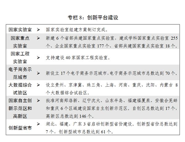 一是創(chuàng)新能力持續(xù)提升。由點(diǎn)及面、有序布局重大科技創(chuàng)新平臺(tái)建設(shè),深入推進(jìn)8個(gè)區(qū)域全面創(chuàng)新改革試驗(yàn)。北京、上海建設(shè)科技創(chuàng)新中心邁出新步伐。河北·京南、浙江、寧波3個(gè)國(guó)家科技成果轉(zhuǎn)移轉(zhuǎn)化示范區(qū)啟動(dòng)建設(shè)。首個(gè)國(guó)家高速列車(chē)技術(shù)創(chuàng)新中心建成。完全自主知識(shí)產(chǎn)權(quán)中國(guó)標(biāo)準(zhǔn)高速列車(chē)正式投入運(yùn)營(yíng)。建成世界最大單口徑射電望遠(yuǎn)鏡(FAST)等一批重大科技基礎(chǔ)設(shè)施,在量子通信、航空航天等方面取得一批重大科技成果。國(guó)家科技重大專(zhuān)項(xiàng)深入實(shí)施,科技創(chuàng)新2030-重大項(xiàng)目遴選確定。大力推動(dòng)企業(yè)技術(shù)創(chuàng)新,落實(shí)好研發(fā)費(fèi)用加計(jì)扣除、股權(quán)激勵(lì)和技術(shù)入股所得稅優(yōu)惠、完善高新技術(shù)企業(yè)認(rèn)定辦法等政策。