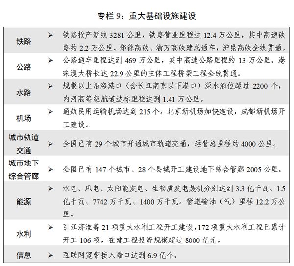 六是基礎(chǔ)設(shè)施網(wǎng)絡(luò)進(jìn)一步完善。加快推進(jìn)現(xiàn)代綜合交通運(yùn)輸體系建設(shè),交通基礎(chǔ)設(shè)施網(wǎng)絡(luò)總里程突破500萬(wàn)公里。交通提質(zhì)增效、扶貧脫貧、重大基礎(chǔ)設(shè)施建設(shè)“一二三百”工程出臺(tái)實(shí)施,推進(jìn)多式聯(lián)運(yùn)發(fā)展,促進(jìn)通用航空業(yè)發(fā)展,推動(dòng)交通物流融合發(fā)展。能源生產(chǎn)和消費(fèi)革命戰(zhàn)略出臺(tái),能源供應(yīng)能力不斷增強(qiáng),非化石能源消費(fèi)比重預(yù)計(jì)上升到13.3%,煤炭消費(fèi)比重下降到62.0%。全國(guó)地級(jí)市基本建成光網(wǎng)城市,新一代信息基礎(chǔ)設(shè)施更加完善,建成全球最大的4G網(wǎng)絡(luò)。