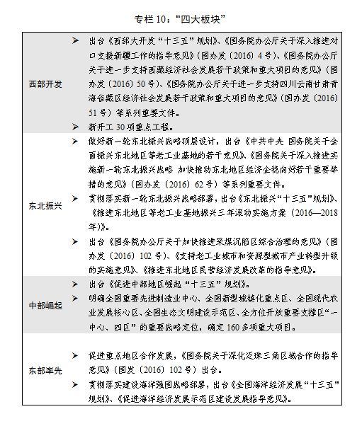 二是區(qū)域發(fā)展總體戰(zhàn)略和差別化區(qū)域政策深入實(shí)施。加快新一輪西部大開(kāi)發(fā),一批重大標(biāo)志性工程開(kāi)工建設(shè),中西部地區(qū)經(jīng)濟(jì)繼續(xù)保持較快增長(zhǎng)。出臺(tái)實(shí)施新一輪?wèn)|北振興戰(zhàn)略和若干重大政策舉措,國(guó)企改革、投資營(yíng)商環(huán)境改善等重點(diǎn)領(lǐng)域改革取得新進(jìn)展。明確中部地區(qū)“一中心、四區(qū)”重要戰(zhàn)略定位,長(zhǎng)江中游城市群重要增長(zhǎng)極作用強(qiáng)化。東部地區(qū)轉(zhuǎn)型升級(jí)、開(kāi)放創(chuàng)新、陸海統(tǒng)籌優(yōu)勢(shì)持續(xù)發(fā)揮,區(qū)域發(fā)展新動(dòng)能新亮點(diǎn)不斷涌現(xiàn)。出臺(tái)促進(jìn)區(qū)域協(xié)調(diào)發(fā)展的指導(dǎo)意見(jiàn),差別化區(qū)域政策體系持續(xù)完善。國(guó)家綜合配套改革試驗(yàn)區(qū)、國(guó)家級(jí)新區(qū)及各類(lèi)開(kāi)發(fā)區(qū)、承接產(chǎn)業(yè)轉(zhuǎn)移示范區(qū)、產(chǎn)城融合示范區(qū)、臨空經(jīng)濟(jì)示范區(qū)等重要功能平臺(tái)建設(shè)有序推進(jìn)。加快革命老區(qū)、民族地區(qū)、邊疆地區(qū)和集中連片特困地區(qū)脫貧攻堅(jiān)。完善支持政策措施,推進(jìn)新疆、西藏、四省藏區(qū)經(jīng)濟(jì)社會(huì)發(fā)展和長(zhǎng)治久安。