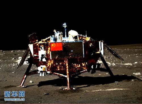 資料圖:嫦娥三號著陸器及器載五星紅旗圖片。該圖是由月球車上全景相機拍攝的。新華社發(fā)(國防科工局供圖) 圖片來源:新華網