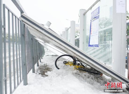 1月4日,安徽合肥望江路衛崗公交站臺被雪壓倒。合肥市公交集團在公交站臺貼出告示:“公交站臺存在安全隱患,請到路邊候車”。 中新社記者 張婭子 攝