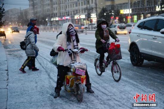 1月6日晚,內(nèi)蒙古呼和浩特市迎來(lái)2018年首場(chǎng)降雪,路面濕滑,民眾出行受到一定影響。中新社記者 劉文華 攝