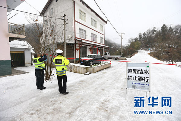 因道路坡陡,路面結冰,湖北五峰土家族自治縣“路長”朱漢軍(左)和袁樂軍(右)在劉家坳路段拉起簡易警戒線(1月5日攝)。新華社記者 王自宸 攝