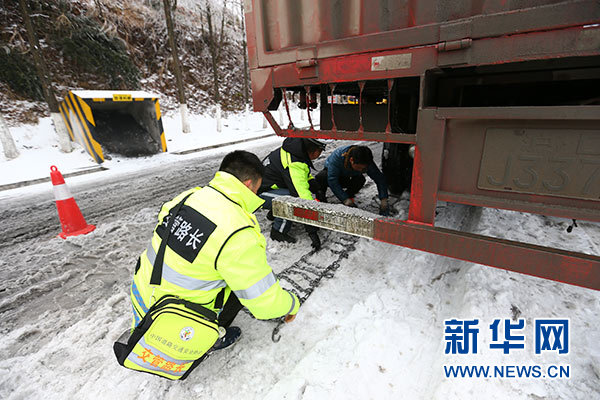 湖北五峰土家族自治縣仁和坪鎮“路長”高恩強(左一)在楊柳池村到金家垴路段指導過往貨車安裝防滑鏈(1月5日攝)。新華社記者 王自宸 攝