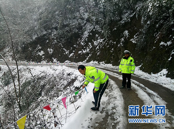 在湖北長陽土家族自治縣磨市鎮烏缽池村級公路,“路長”魏遠義(右)和張昌軍(左)在積雪塌方路段拉警示繩(1月7日攝)。新華社記者 王自宸 攝